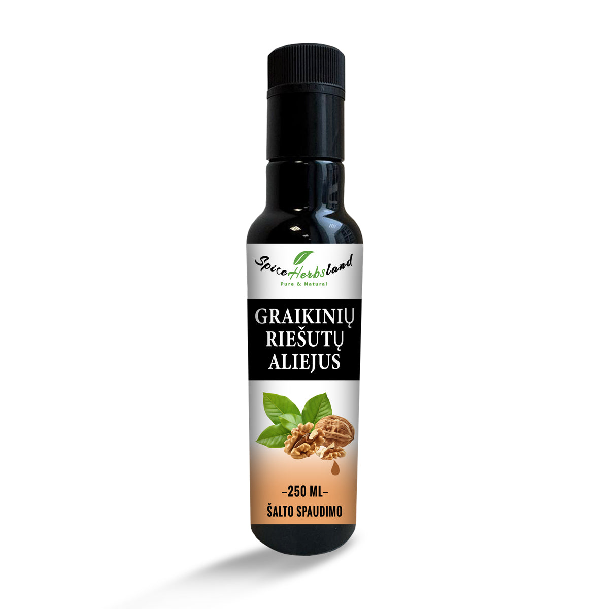 Graikių riešutų aliejus yra prabangus, maistingas aliejus, išgautas iš aukščiausios kokybės graikinių riešutų, naudojant šalto spaudimo metodą, siekiant išlaikyti jo natūralius antioksidantus ir svarbiąsias riebalų rūgštis. Žinomas dėl savo gilios maitinamosios ir priešuždegiminės savybės, šis aliejus palaiko odos sveikatą, pažinimo funkcijas ir širdies gerovę. Jo turtingas, riešutinis skonis suteikia gurmanišką skonį tiek saldiems, tiek sūriems patiekalams.